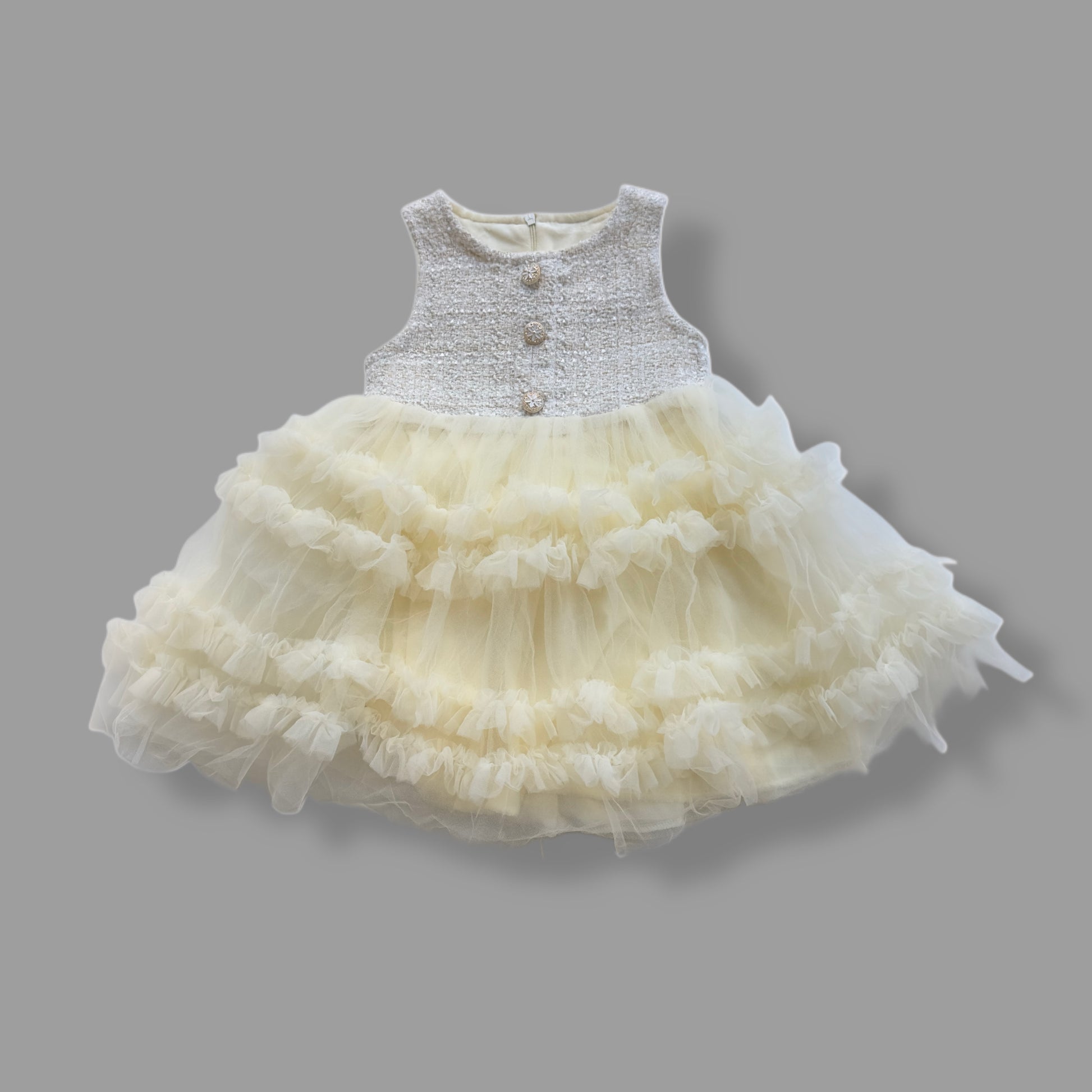 Incluye un vestido con falda de tul en capas y una chaqueta tipo tweed con forro polar.