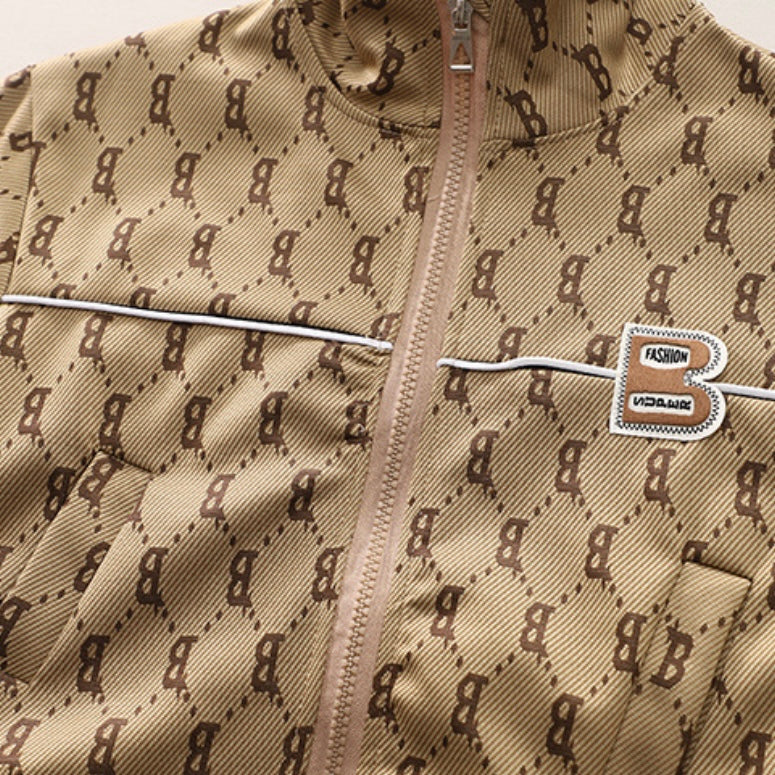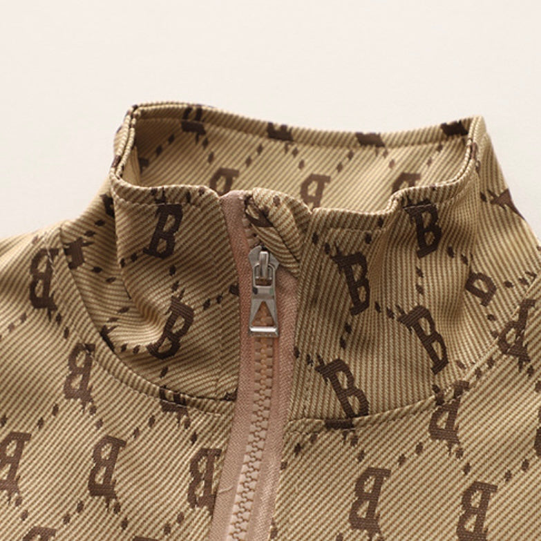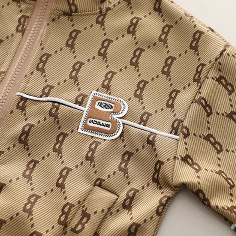 Este conjunto de tres piezas para niño combina abrigo, estilo y practicidad. Incluye un polerón de manga larga, pantalón cómodo y un bolso cruzado con la letra “B” que añade un toque moderno y original.