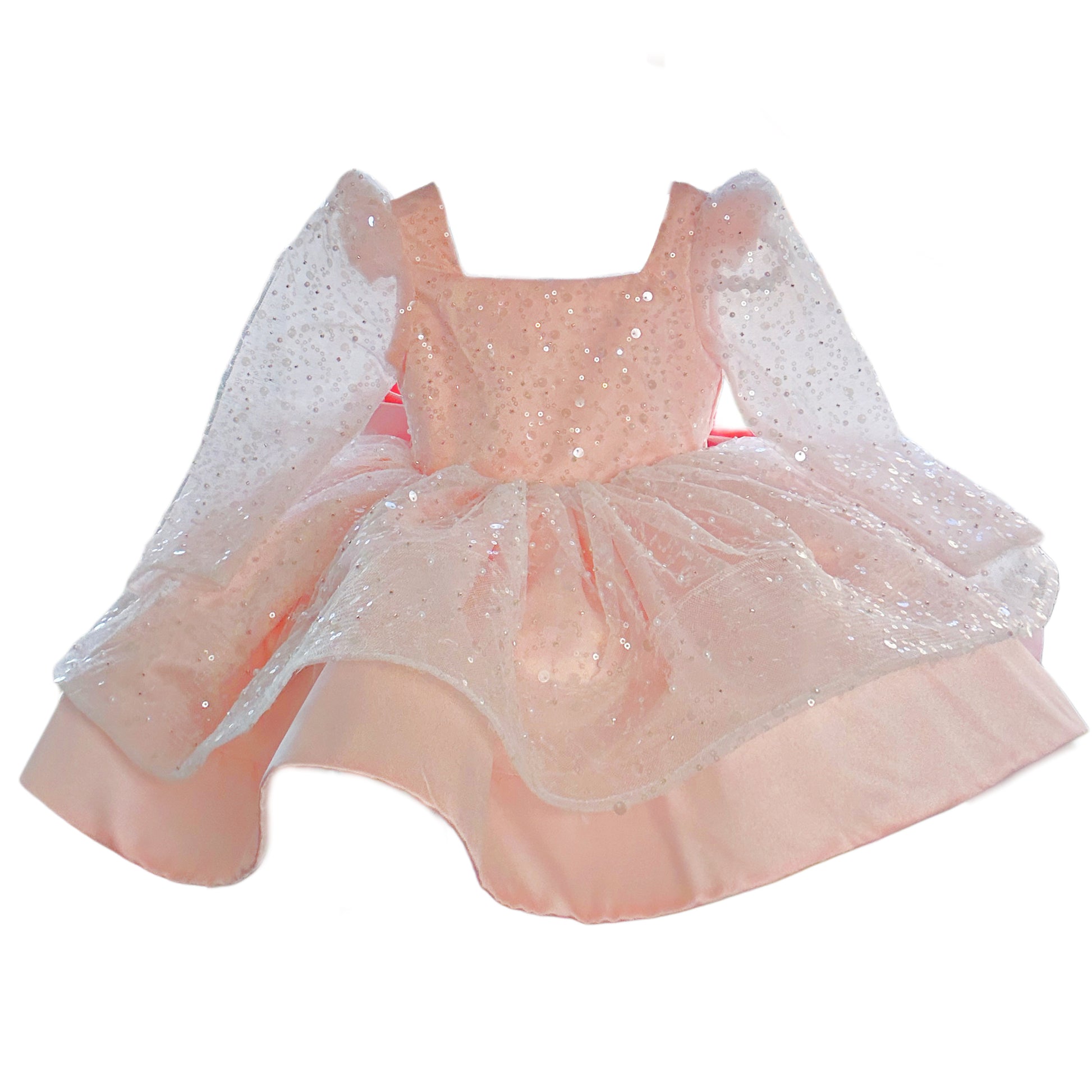 Hermoso vestido rosa para niña con mangas largas — perfecto para fiestas, sesiones de fotos o eventos especiales.