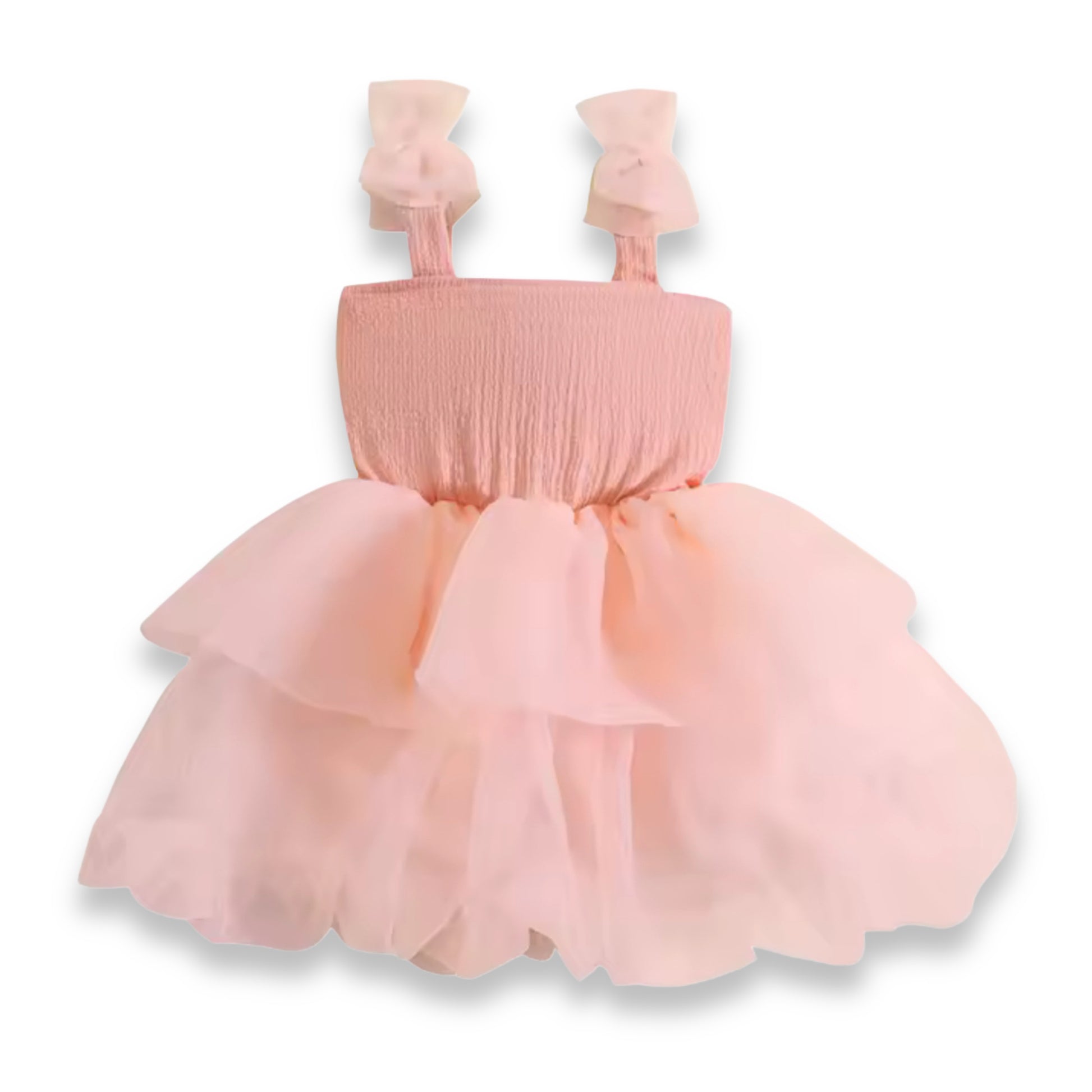 Vestido delicado con falda de tul en capas, perfecto para celebraciones, sesiones de fotos y días especiales.