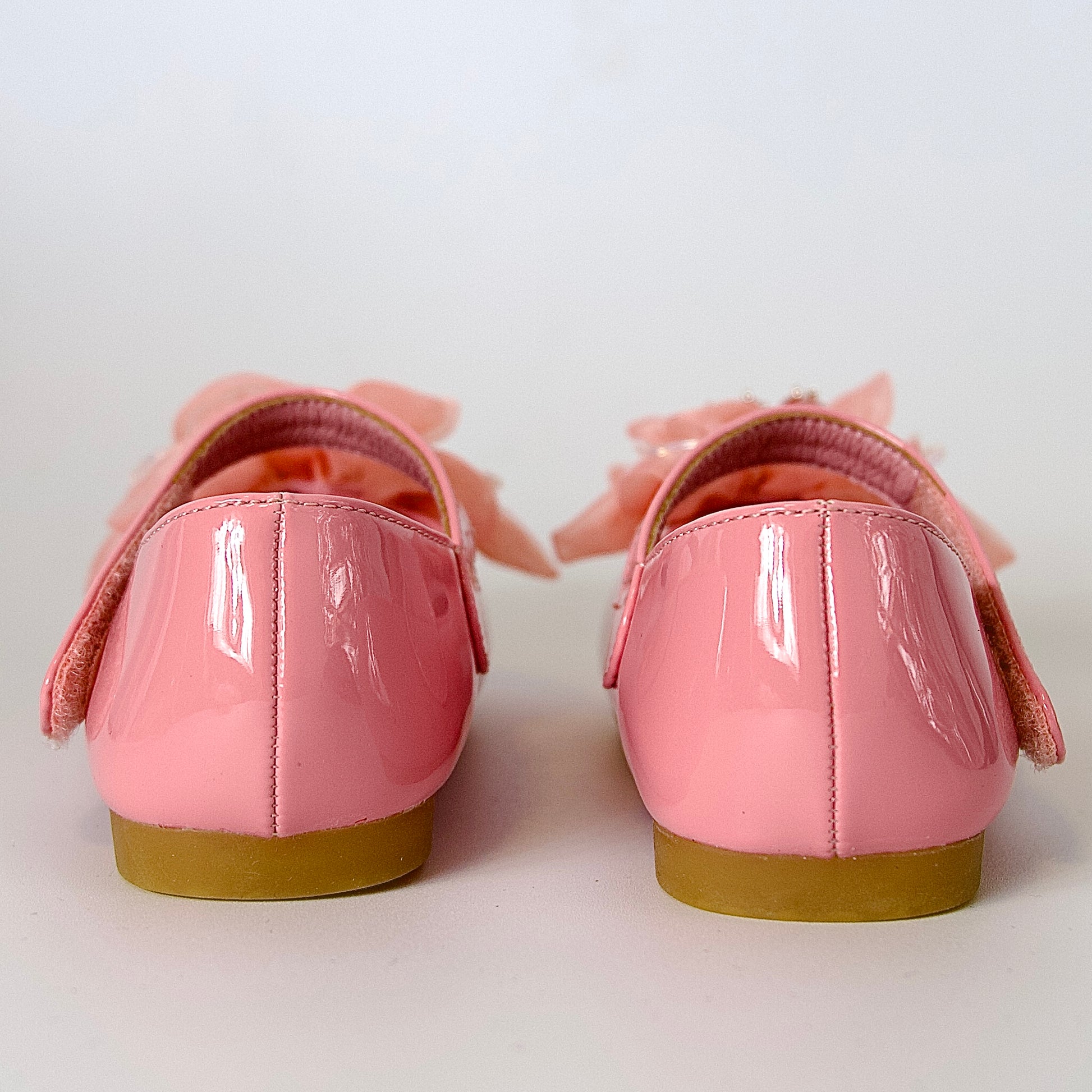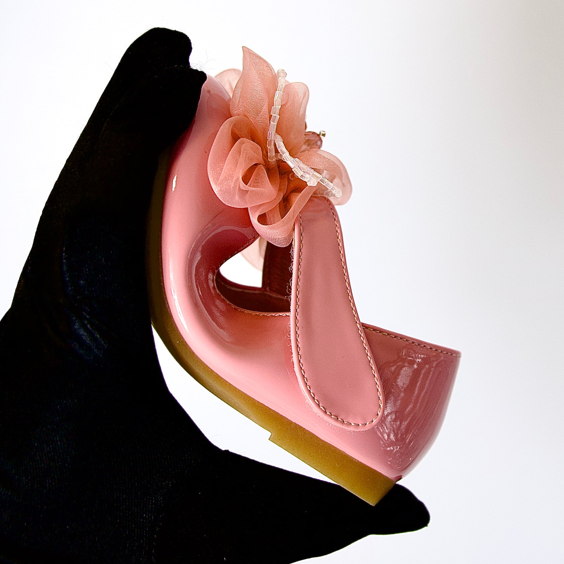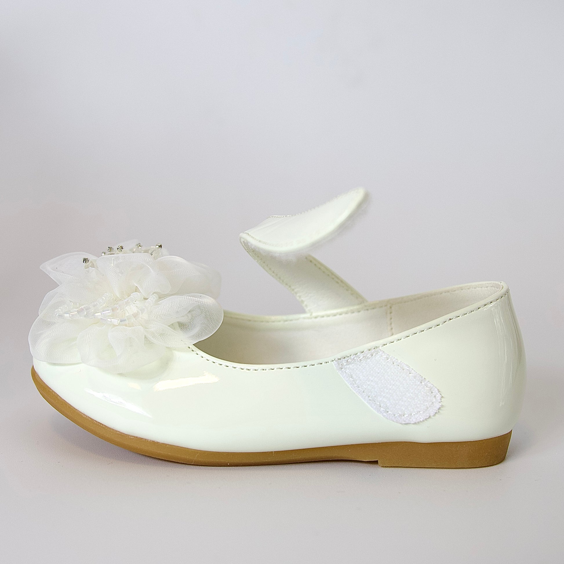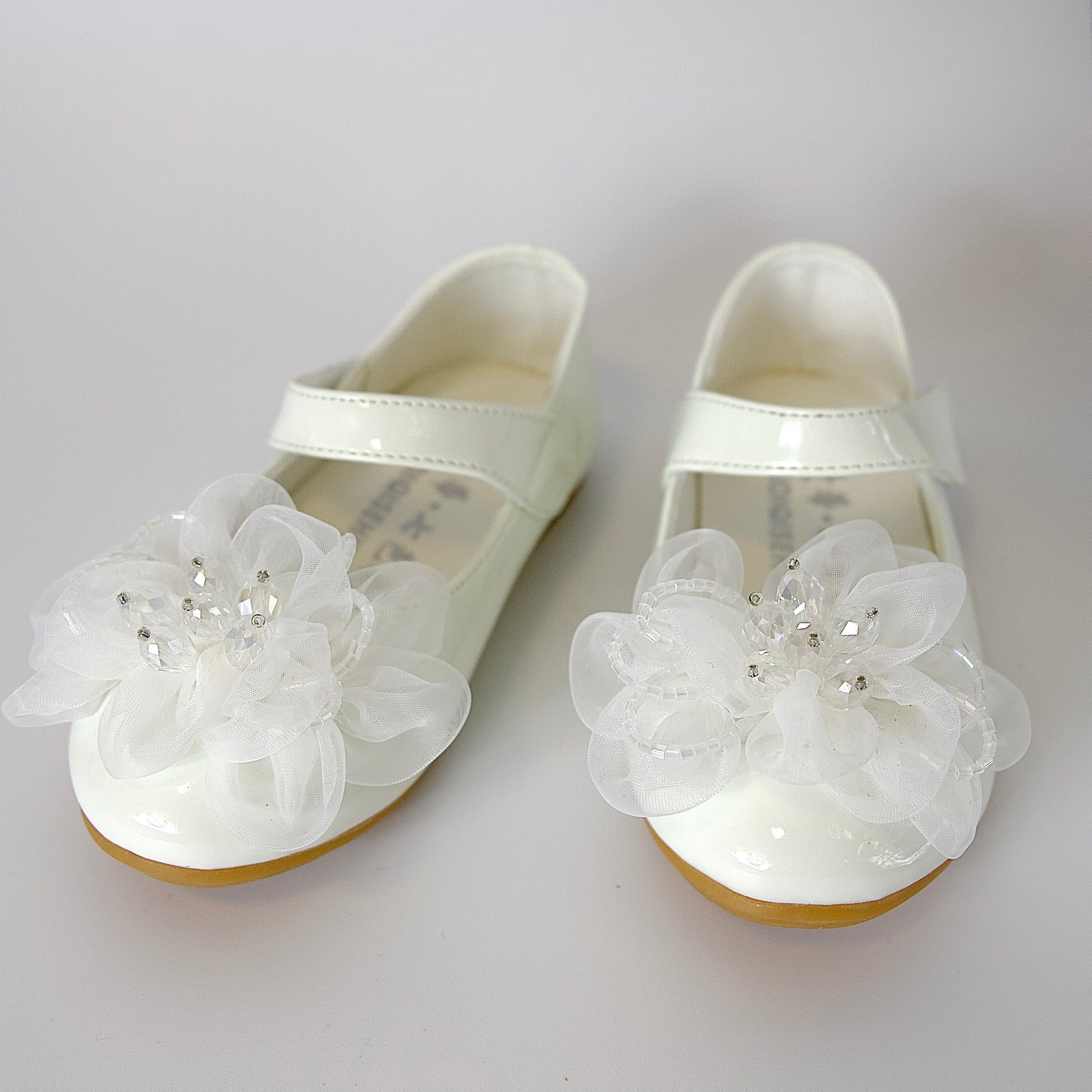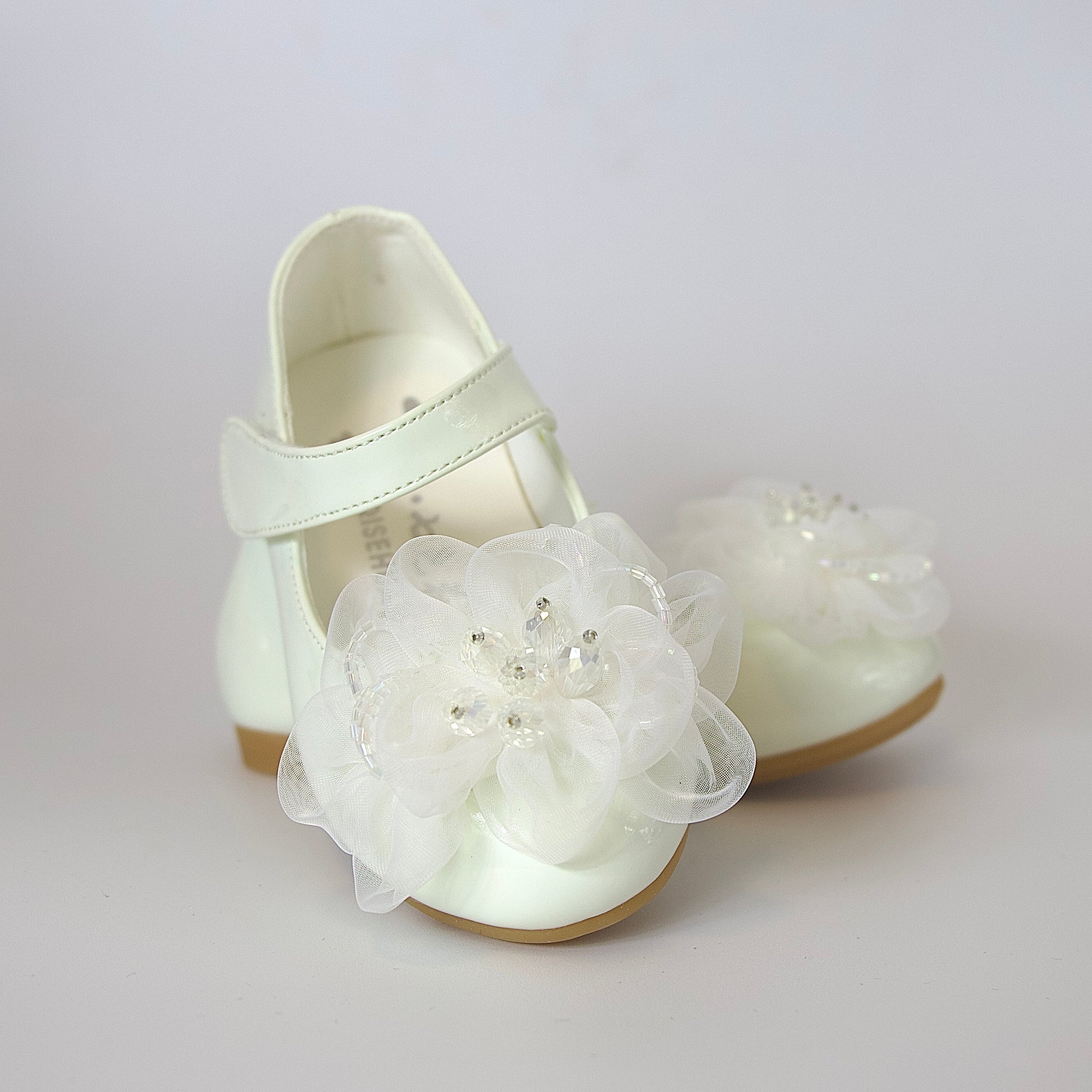 Estas adorables zapatillas de charol destacan por su gran flor decorativa, bordada con cuentas y perlas. Su diseño cómodo y suave es ideal para los primeros pasos de tu pequeña princesa.